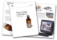 To promote the DVR to the sales channel, we chose two different items. First was a brochure focused on 10 end-user benefits such as Say goodbye to your videotape hassles forever, Eliminate day-to-day maintenance costs and Make surveillance simple. Secondly, we chose a Web site specifically focused on the needs of dealers and end users new to digital recording. Artwork for the two projects included product photographs, screenshots and images of the technology itself, along with artwork pertaining to the common cure theme. On the front of the brochure we included a photograph of the pill bottle we created and made sure the label on the bottle could be read. We then took this strong image and carried it through the rest of the promotion.